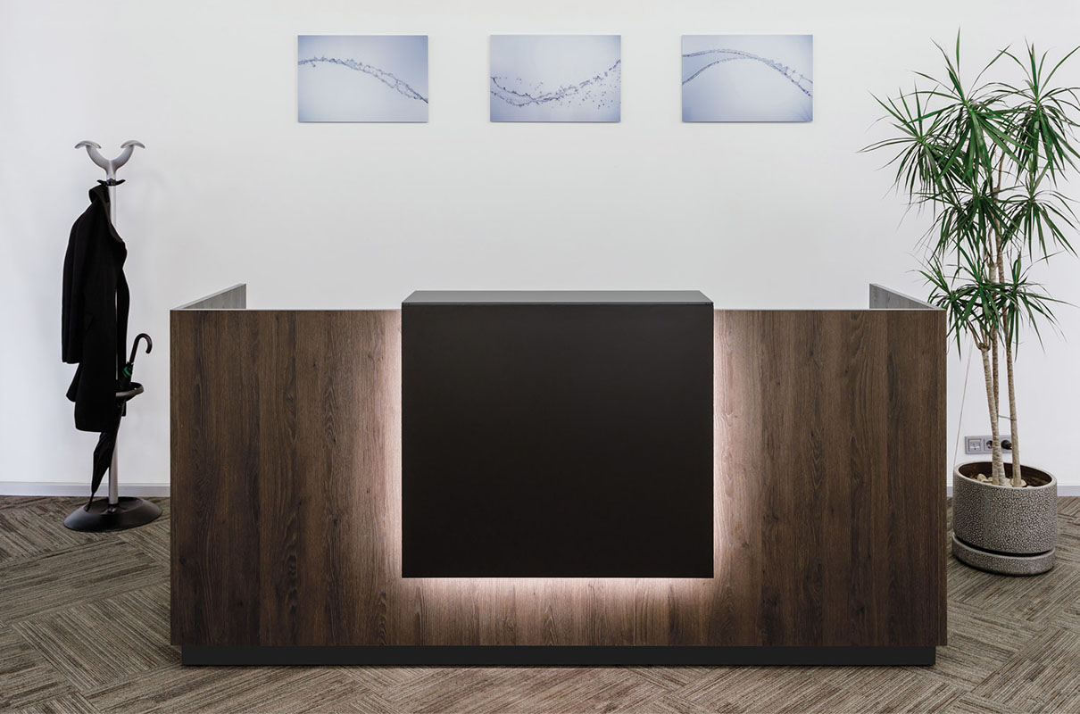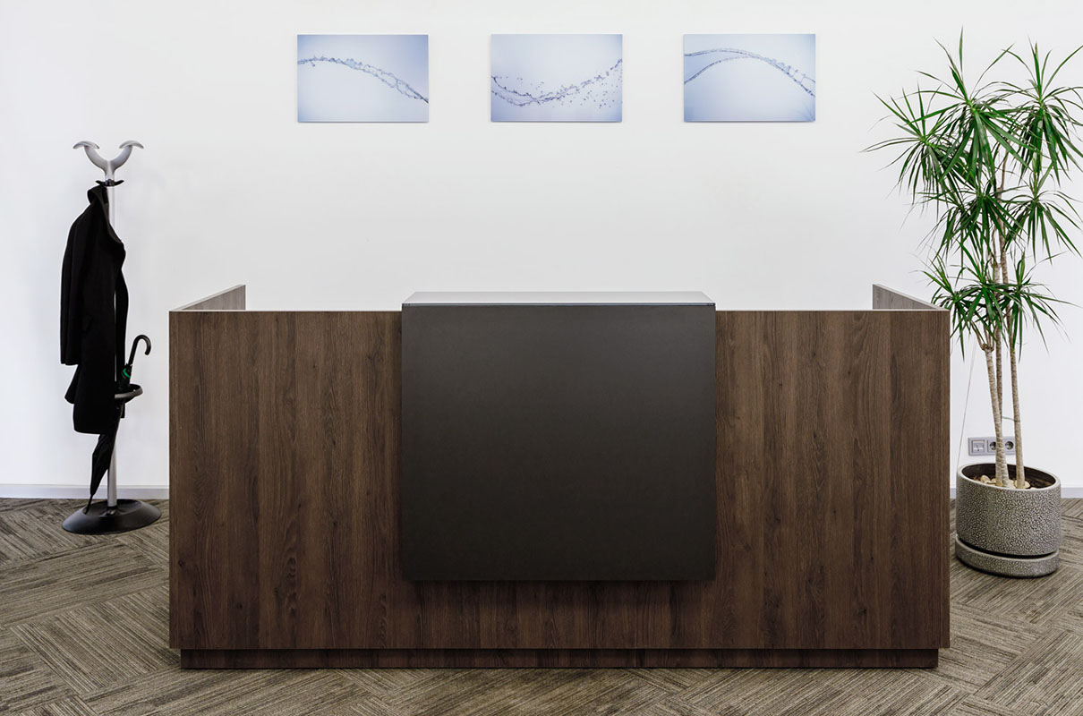 Модули стойки имеют цоколь, изготовленный из МДФ и облицованный прочным пластиком. Это делает нижнюю часть приемной стойки износостойкой и невосприимчивой к механическим (удары ботинками) и химическим (мытье полов моющими средствами) воздействиям.В складской программе цоколь доступен в цвете графит, на заказ возможен цоколь в цвете брашированный алюминий (срок поставки — 4 недели).
