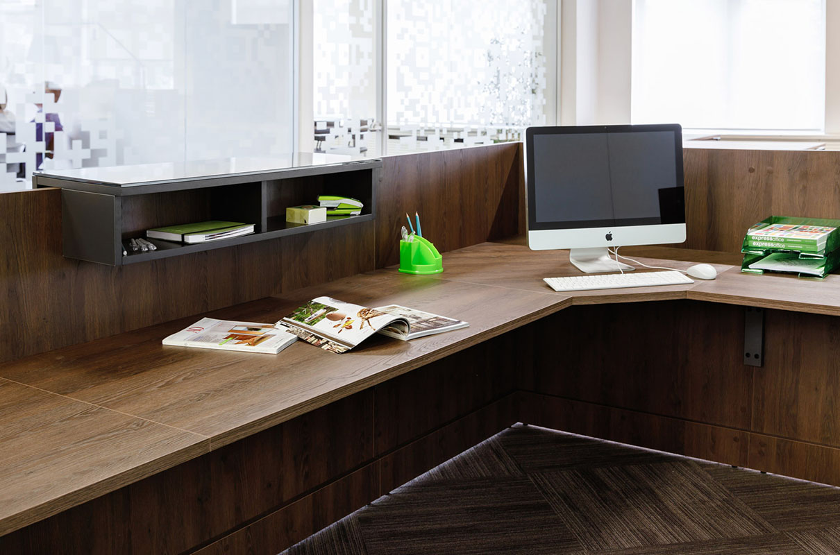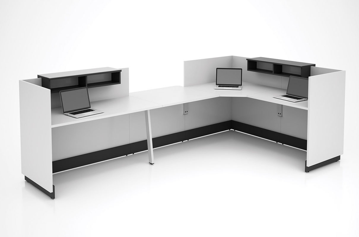 Модули крепятся при помощи усиленного крепежа, который позволяет не использовать опоры при длине до трех модулей — с внутренней стороны приемная стойка очень просторная и позволяет комфортно разместиться нескольким сотрудникам.Материал: ДСП