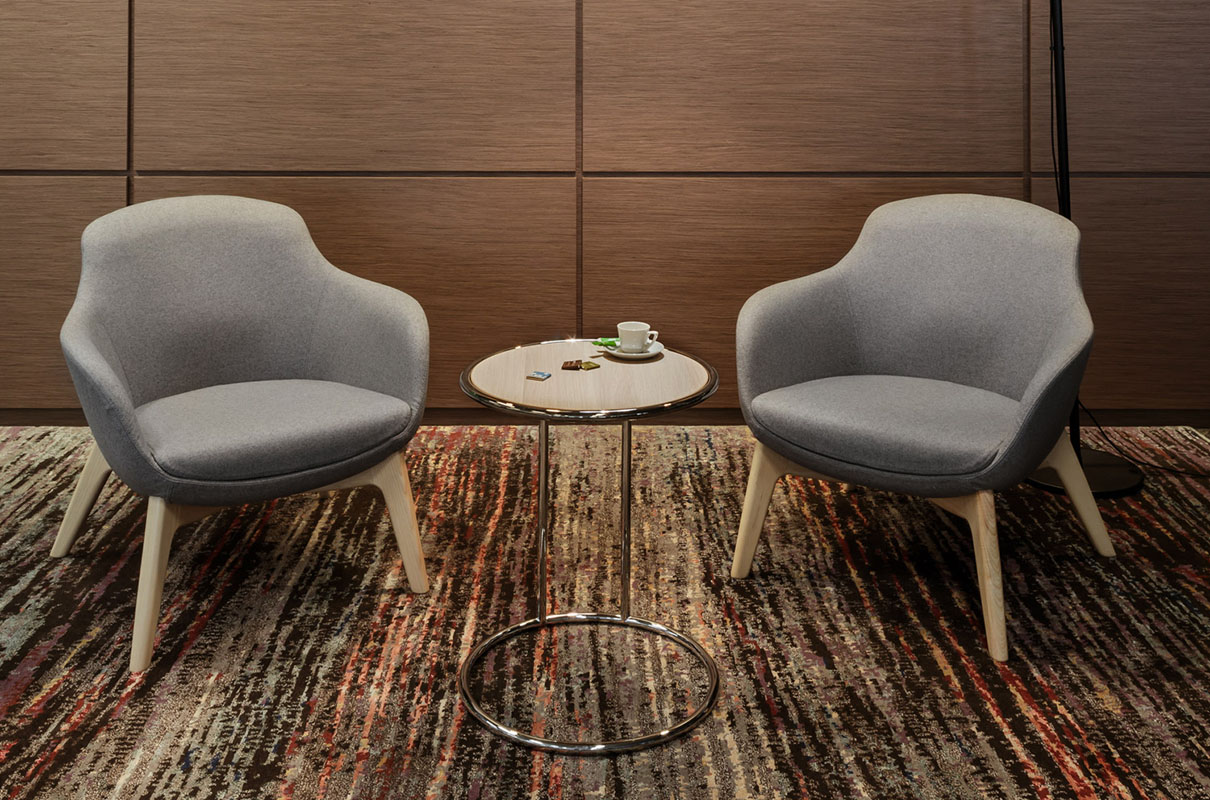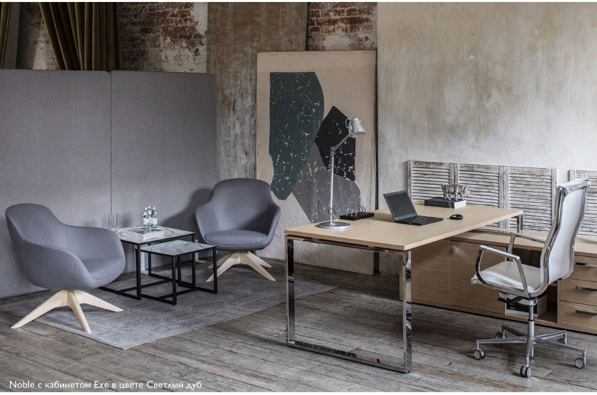 Noble является продолжением линейки Elegance. Формы и материалы коллекции перекликаются между собой, создавая элегантный и стильный ансамбль. Некрашеные деревянные опоры из массива ясеня созвучны с войлочной обивкой благородного оттенка серого, а невысокая хромированная крестовина безукоризненно сочетается с черной кожей.