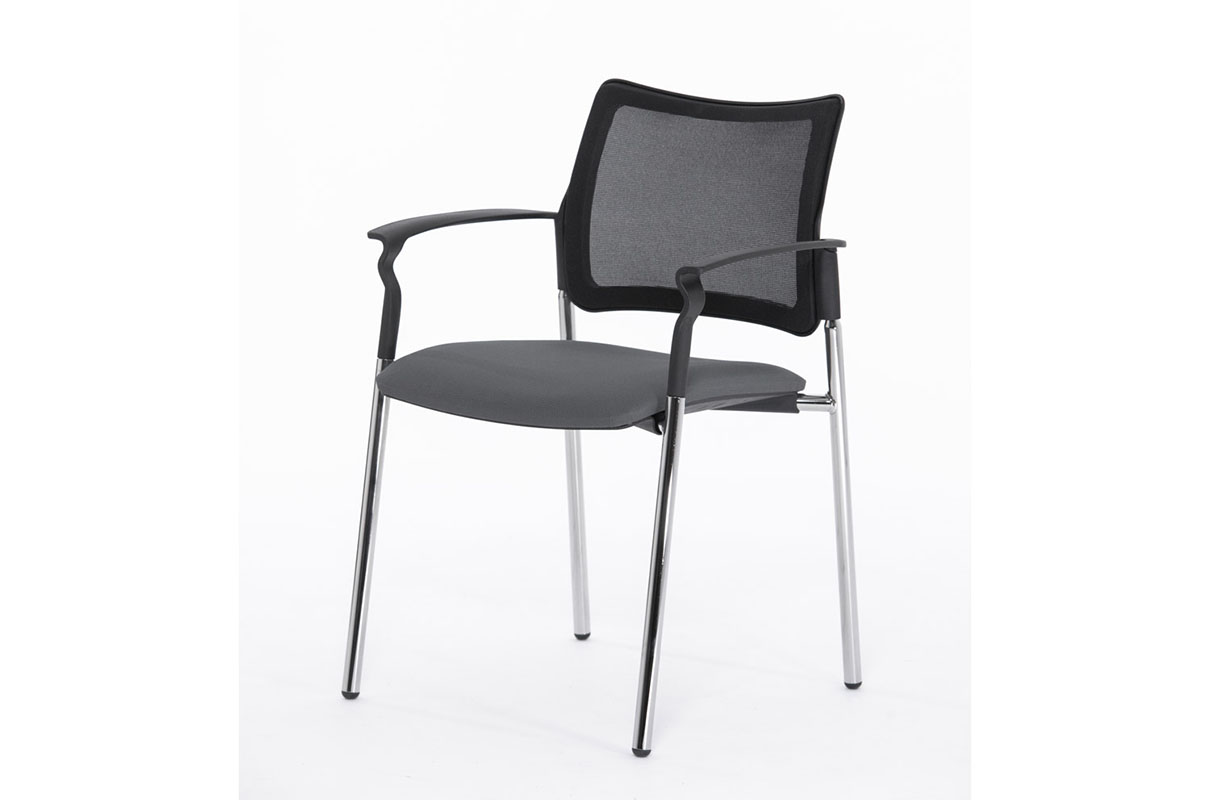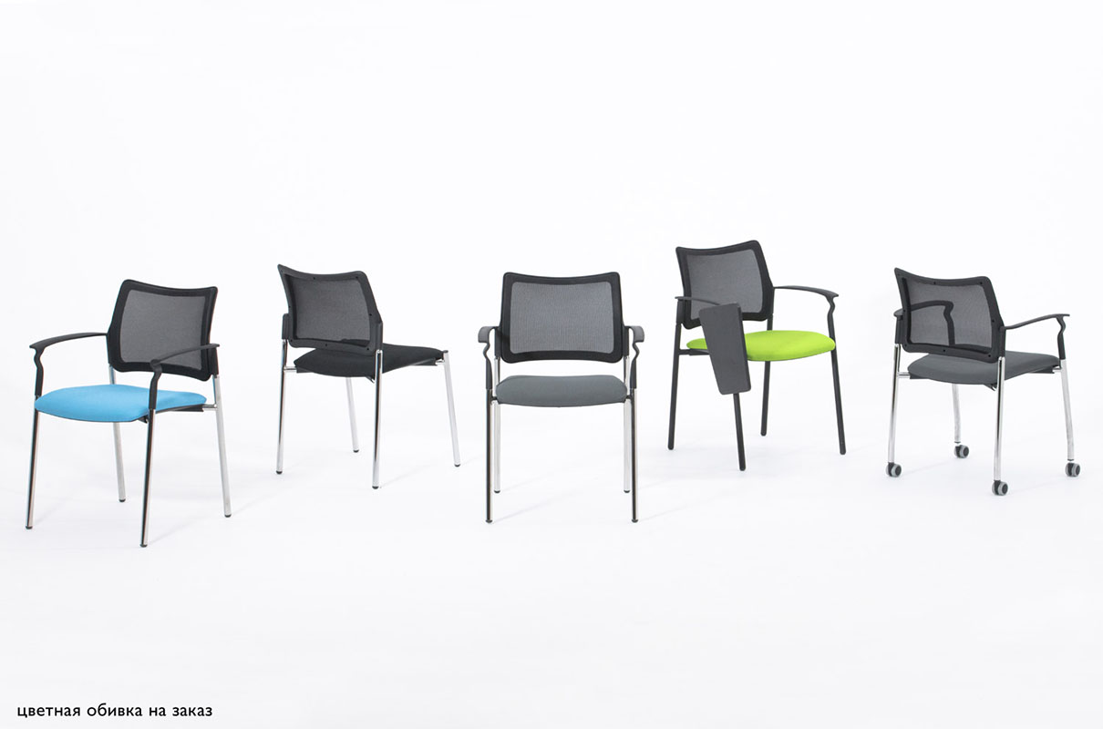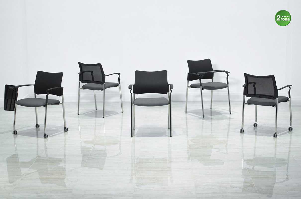 В складскую программу включены штабелируемые по пять штук кресла с черной пластиковой спинкой — на четырех опорах и на колесах, без подлокотников и с подлокотниками, а также со столиком.Материал сиденья: ткань, цвет — серый