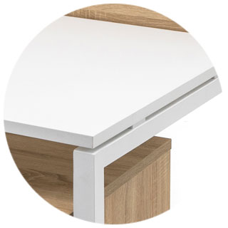 Между столешницей и поперечной частью П-образной опоры имеется металлическая вставка в цвете опоры, зазор между опорой и столешницей придает визуальную легкость конструкции. Столешница может быть дополнена передней панелью в белом цвете и фронтальными экранами ДСП или обитыми тканью.