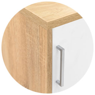 В тумбах и шкафах кромка нанесена не только на видимые части (толщина кромки — 2 мм), но и на невидимые (толщина — 0,5 мм), что позволяет многократно собирать и разбирать мебель, а также предотвращает испарение формальдегидов из ДСП.